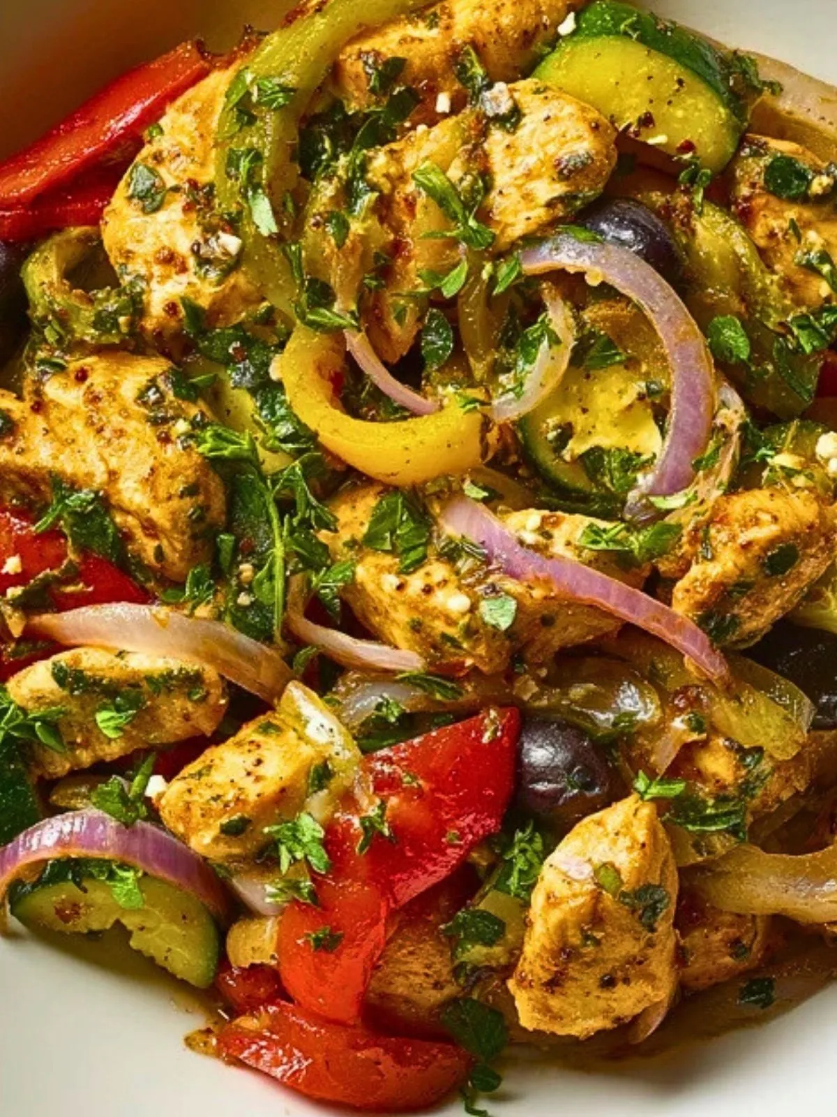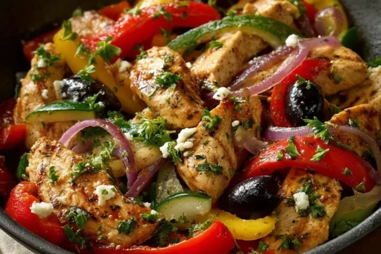 Sauté de poulet méditerranéen facile, coloré et parfumé, où des lanières de poulet moelleux sont sautées avec des poivrons, courgette, oignon rouge, olives noires et feta, le tout relevé d’une marinade à l’huile d’olive, citron, ail, origan et paprika pour un plat complet prêt en moins de 40 minutes.