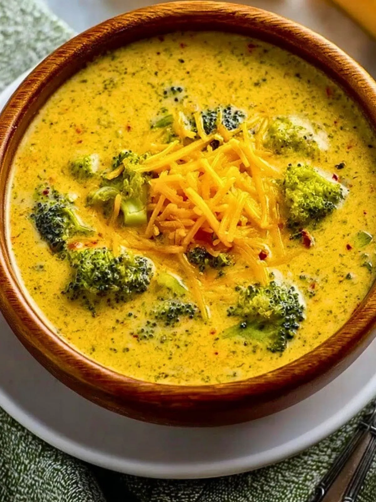 Cette soupe crémeuse au brocoli et au fromage cheddar est douce, veloutée et très réconfortante. Le brocoli apporte une belle fraîcheur végétale, tandis que le cheddar donne une texture riche et fondante à chaque cuillerée. C’est une soupe familiale, simple à préparer, parfaite pour un déjeuner chaleureux ou un dîner léger accompagné de pain croustillant.