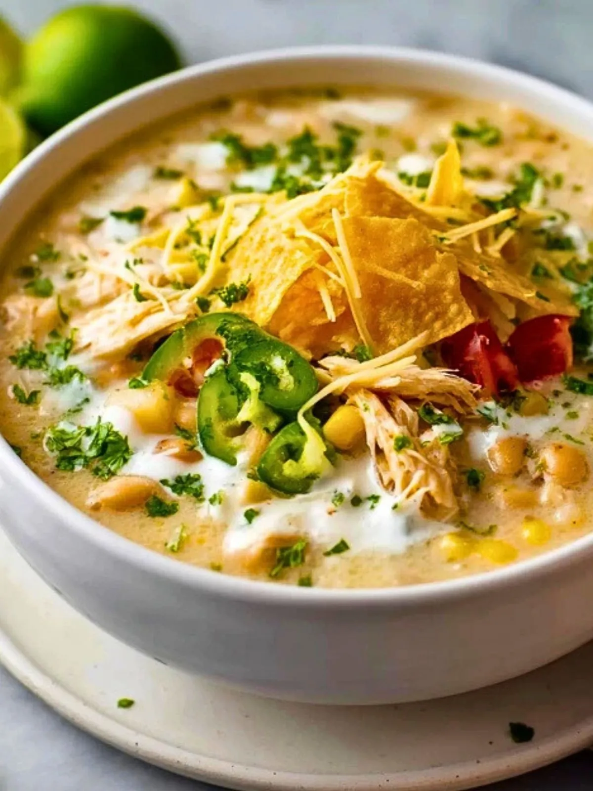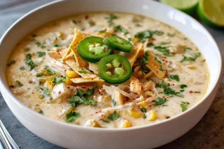 Cette soupe crémeuse aux enchiladas de poulet blanc est un plat complet, onctueux et réconfortant, préparé avec du poulet tendre, des haricots blancs, du maïs, des piments verts doux et une base crémeuse au fromage. Facile à réaliser et parfaite pour les repas chaleureux, elle se garnit de chips tortilla, de coriandre fraîche et de jalapeño pour un résultat généreux, parfumé et plein de texture.