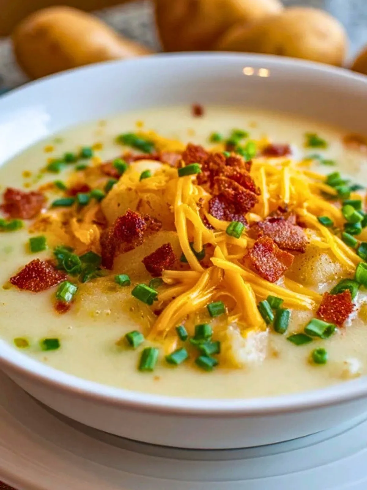 Cette soupe plaît autant parce qu’elle réunit tout ce que l’on attend d’un plat réconfortant : une texture épaisse et soyeuse, un goût doux de pomme de terre relevé par des garnitures savoureuses, et une préparation accessible avec des produits du quotidien. Elle peut être servie comme dîner simple, entrée généreuse ou repas complet avec du pain de campagne, ce qui la rend aussi pratique qu’irrésistible.