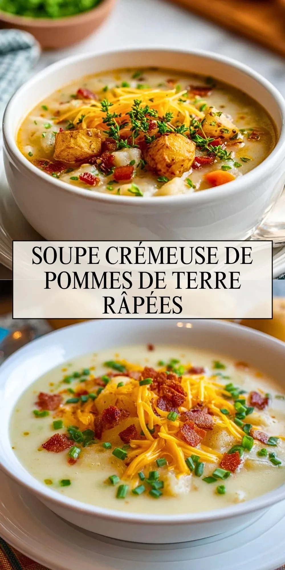 Keywords: soupe crémeuse pommes de terre, soupe pommes de terre râpées, soupe au cheddar, soupe réconfortante, soupe au lard