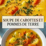 Rien de plus réconfortant qu’une belle soupe maison lorsqu’il fait frais dehors. La soupe de carottes et pommes de terre s’impose comme un classique intemporel, avec sa texture veloutée, ses saveurs douces et légèrement sucrées, et sa couleur éclatante qui met immédiatement de bonne humeur. Elle est parfaite pour un dîner léger ou en entrée raffinée, et plaît autant aux petits qu’aux grands grâce à sa simplicité et sa gourmandise naturelle.