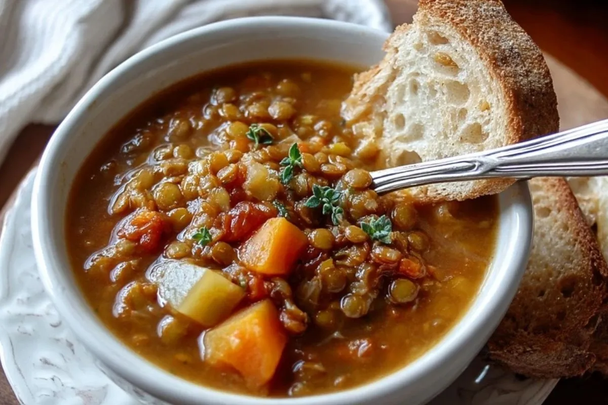 Soupe De Lentilles De Mamie est une soupe familiale généreuse, préparée avec des lentilles vertes, des légumes fondants et un bouillon parfumé aux herbes. Réconfortante, simple et économique, elle se déguste bien chaude avec du pain croustillant pour un repas complet et chaleureux.