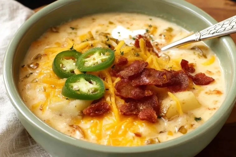 La soupe de pommes de terre aux jalapeños est le genre de plat qui réchauffe instantanément la table. On y retrouve la douceur des pommes de terre fondantes, le crémeux d’un bouillon enrichi de lait et de fromage, puis cette touche vive et légèrement piquante apportée par les jalapeños. Chaque cuillerée offre un bel équilibre entre confort, gourmandise et caractère.