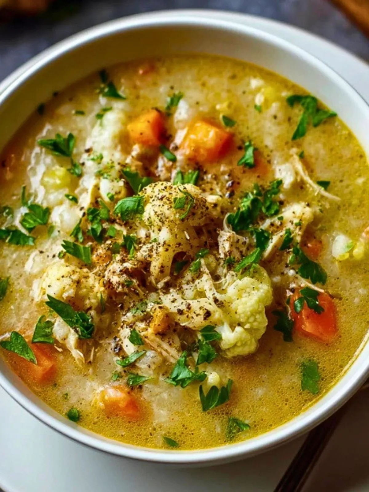 La soupe réconfortante de poulet et chou-fleur est une soupe onctueuse et nourrissante, préparée avec du poulet tendre, des bouquets de chou-fleur fondants, des légumes mijotés et un bouillon crémeux délicatement parfumé. Facile à préparer, elle offre un repas chaud, apaisant et complet, parfait pour les journées fraîches.