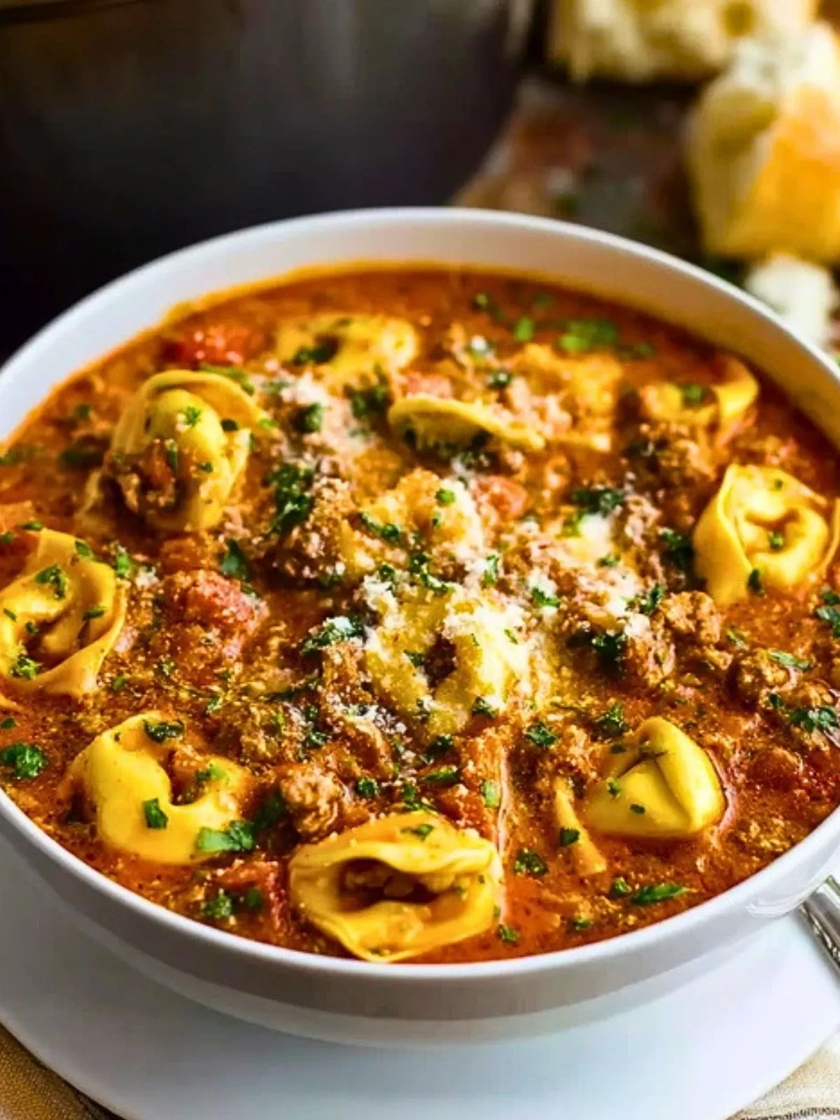 Cette soupe généreuse réunit tout ce qu’on aime dans une lasagne familiale, mais dans une version plus souple, plus rapide et incroyablement réconfortante. Le bouillon tomaté, la viande mijotée, les herbes aromatiques et les tortellinis farcis créent un plat complet, chaleureux et très savoureux, parfait pour les soirs où l’on veut quelque chose de consistant sans passer des heures en cuisine.
