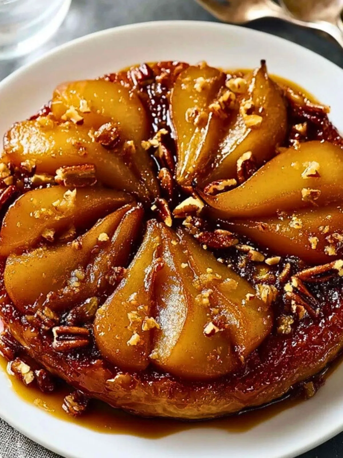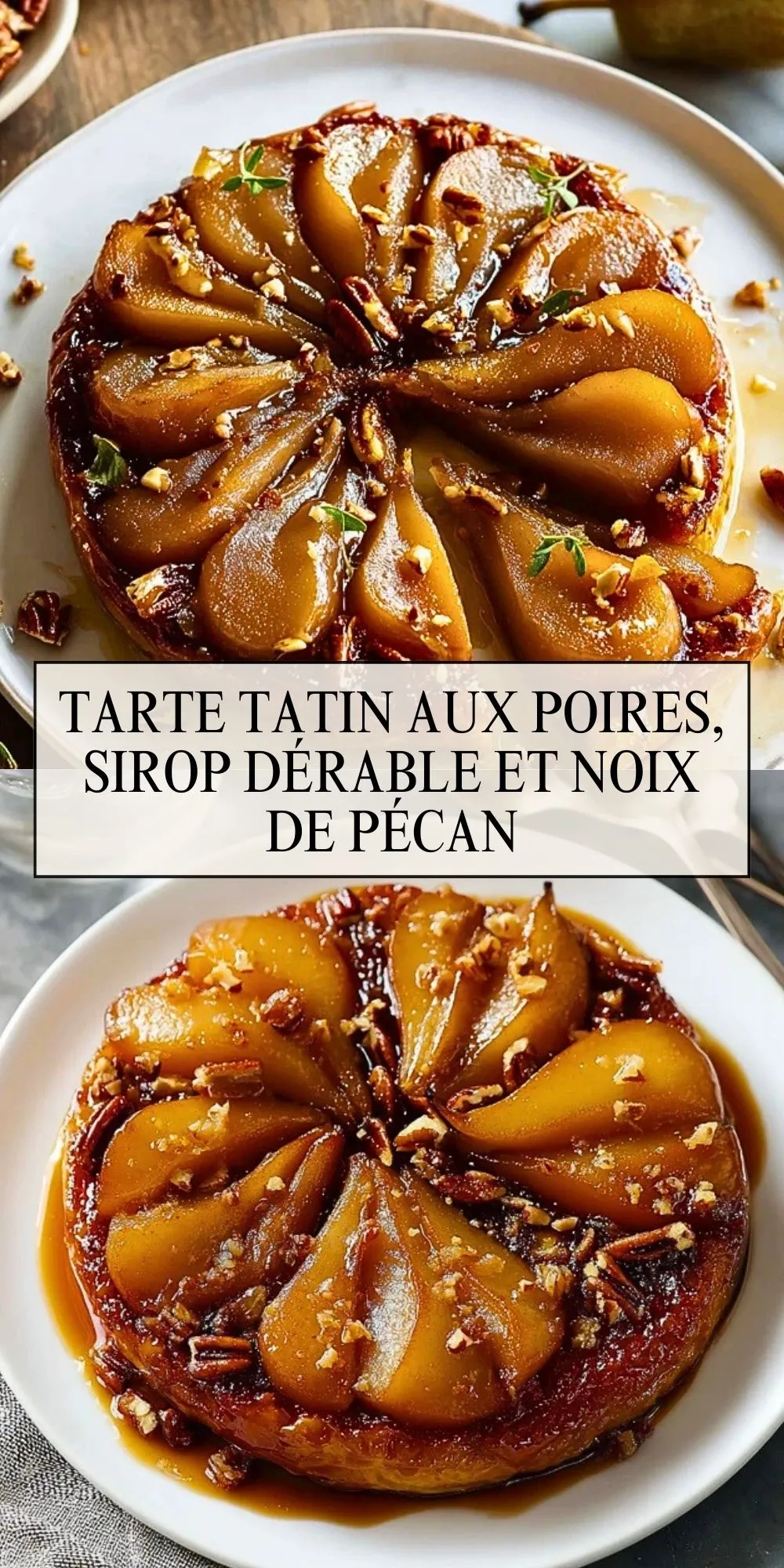 La Tarte Tatin Aux Poires, Sirop DÉrable Et Noix De Pécan revisite un grand classique français avec une touche chaleureuse et gourmande. Les poires fondantes caramélisent doucement dans un mélange de beurre et de sirop d’érable, tandis que les noix de pécan apportent un croquant irrésistible.