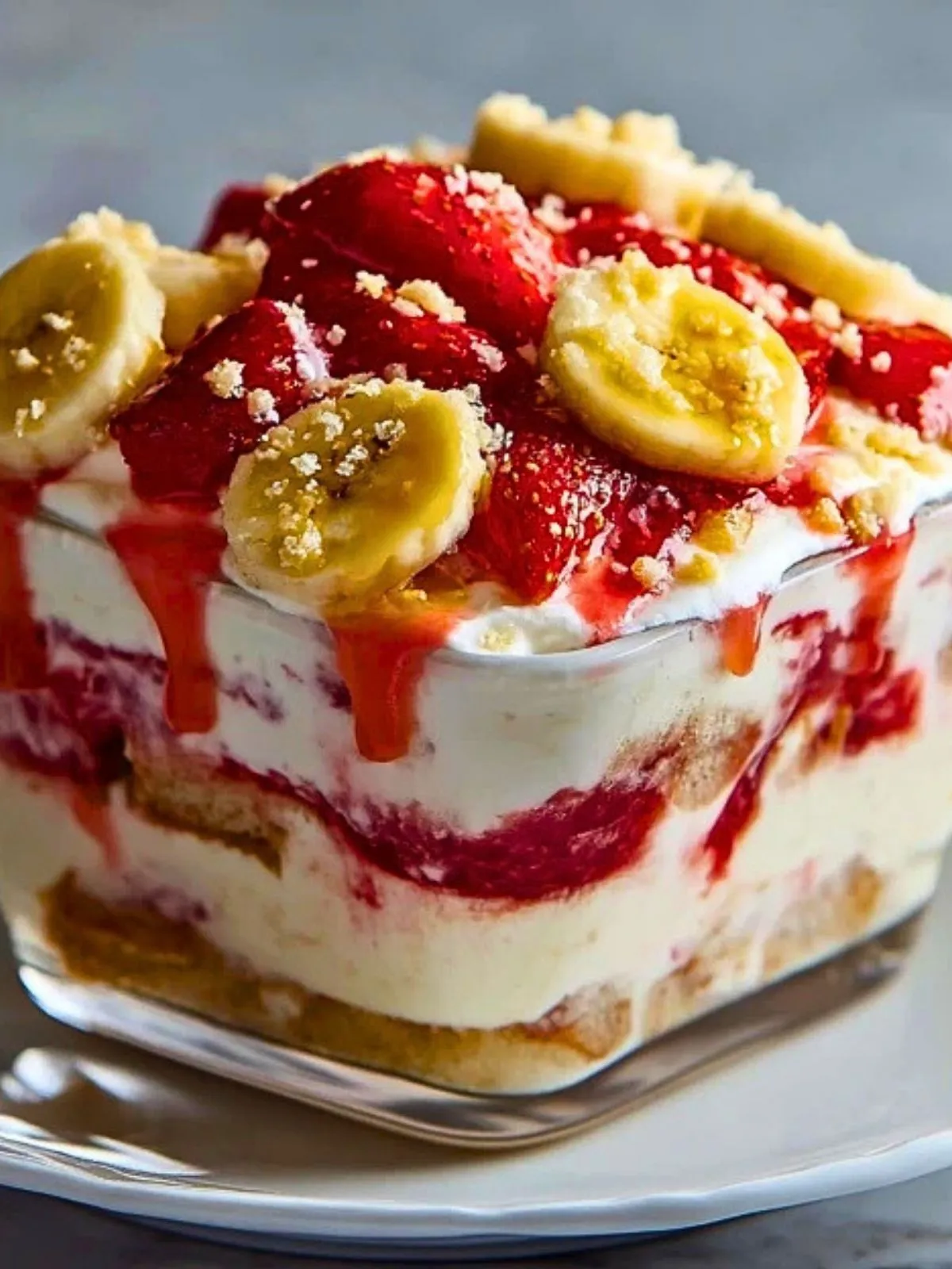 Ce dessert plaît autant parce qu’il réunit des saveurs familières et réconfortantes dans une présentation raffinée. La douceur de la banane équilibre l’acidité fruitée de la fraise, tandis que la crème apporte de la rondeur et que les biscuits absorbent légèrement les jus pour devenir délicatement fondants. Chaque cuillère donne une bouchée complète, fraîche, crémeuse et parfumée.